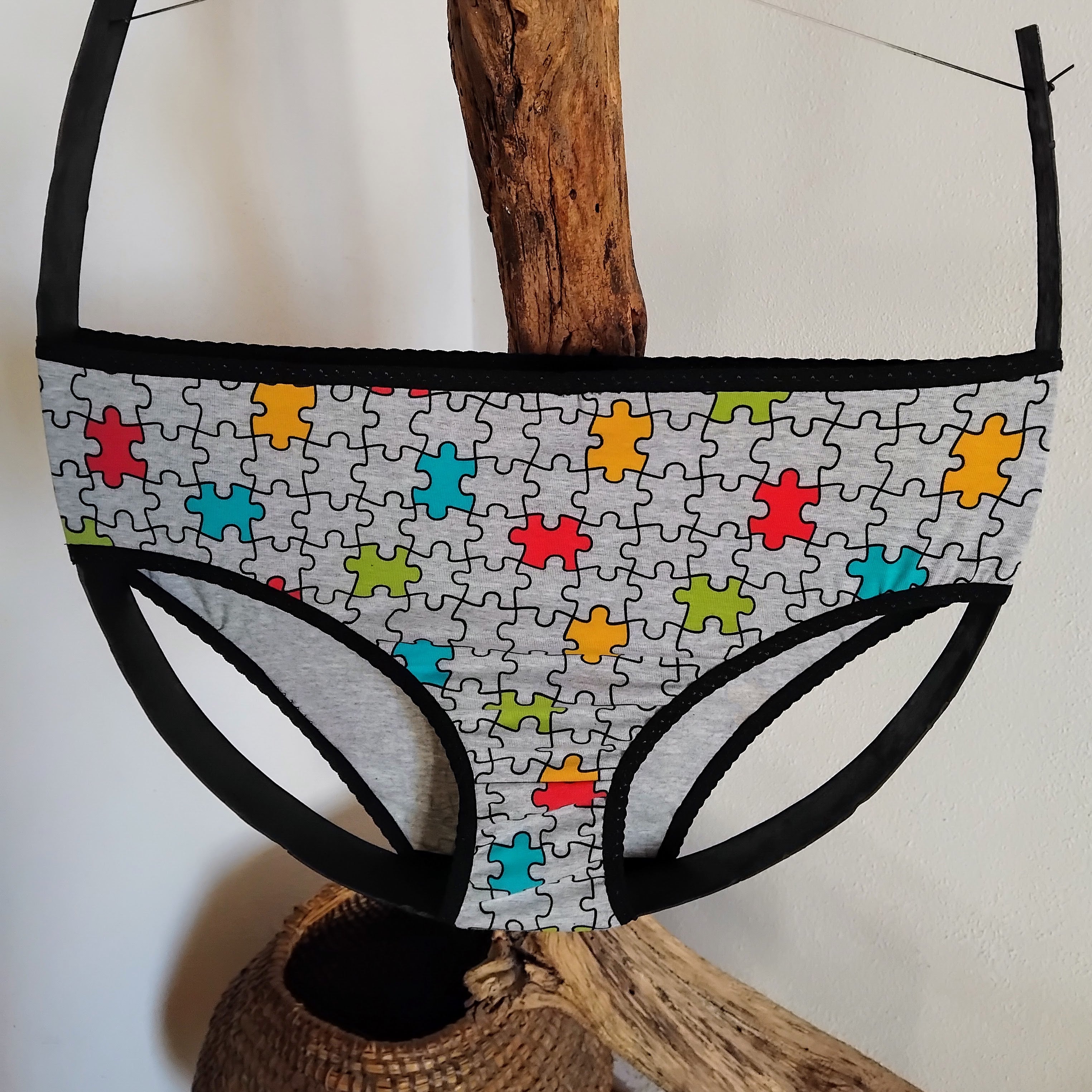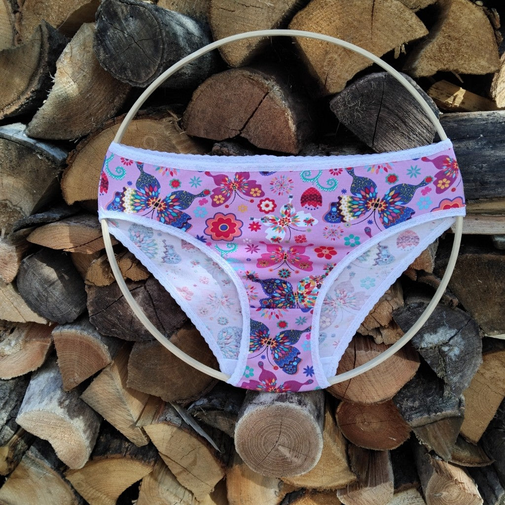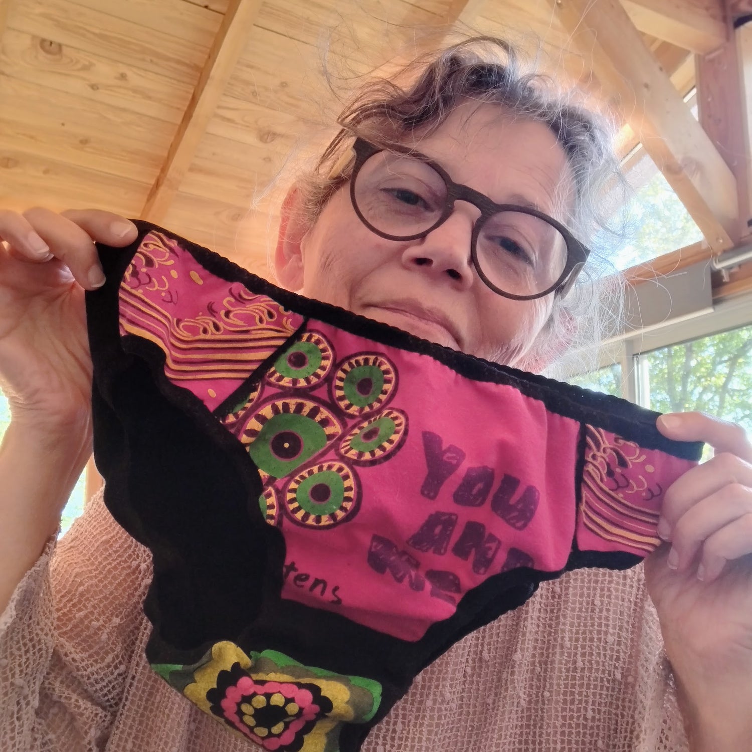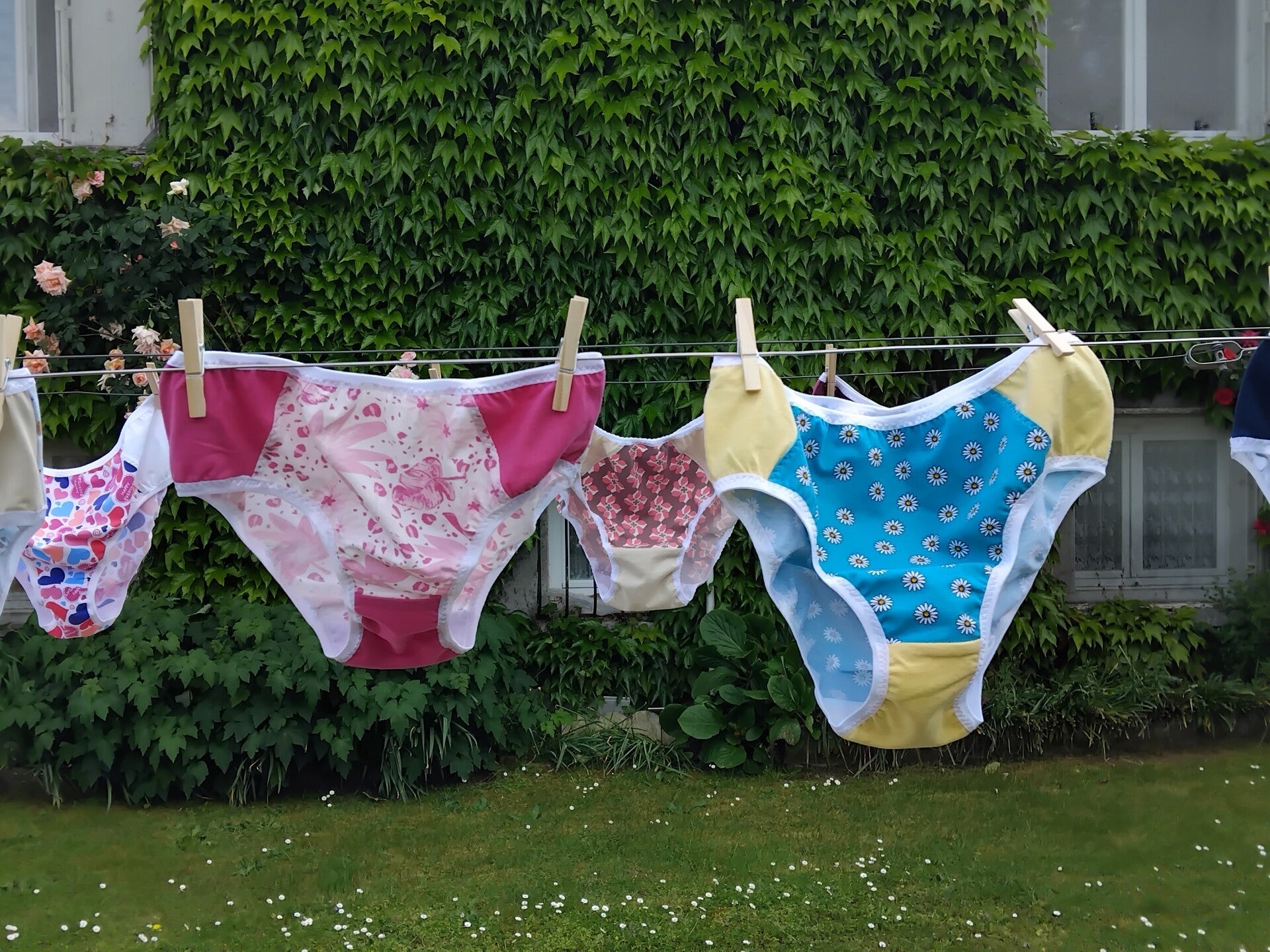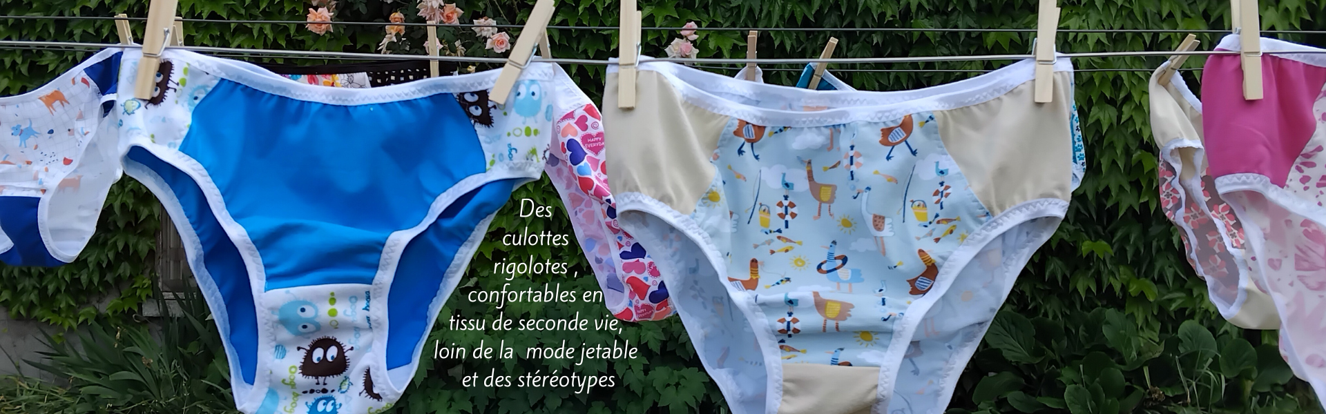Des culottes rigolotes aux motifs qui font sourire et aux couleurs qui donnent la pêche, cousues à partir de textiles de seconde vie.